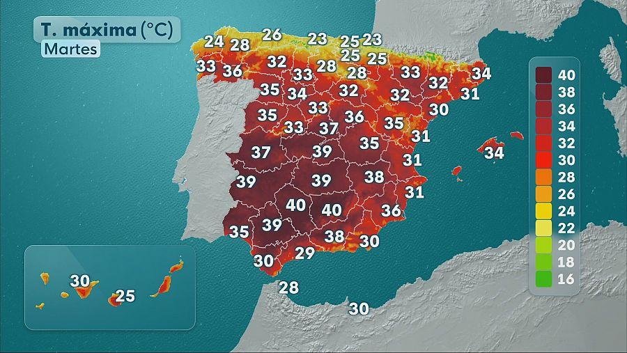 Las temperaturas máximas van a descender en el entorno cantábrico, alto Ebro, Valencia y en puntos de Alborán, pero van a aumentar en Canarias, la vertiente atlántica y extremo nordeste peninsular. Pocos cambios en el resto. Se espera superar los 36 grados en amplias zonas del centro y mitad sur peninsular, e incluso los 38 en áreas de Andalucía.
