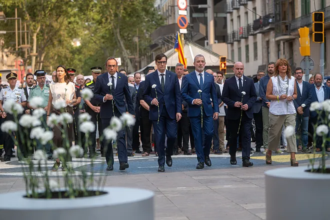 En segundo plano se han encontrado las autoridades, quienes también han depositado flores en las jardineras, y los servicios de emergencias. De la esfera política, han asistido el presidente de la Generalitat, Salvador Illa; el del Parlament, Josep Rull; el alcalde de Barcelona, Jaume Collboni, y el delegado del Gobierno en Cataluña, Carlos Prieto.