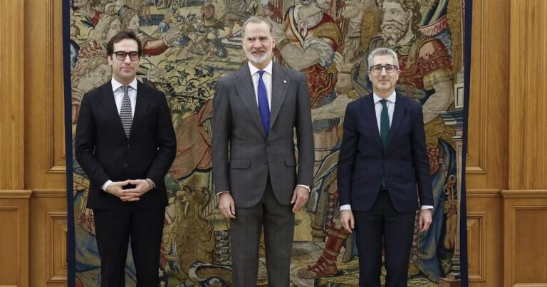 El ministro de Economía, Comercio y Empresa y nuevo vicepresidente primero del Gobierno, Carlos Cuerpo, y el recién nombrado ministro de Hacienda, Arcadi España, han prometido este viernes sus nuevos cargos ante Felipe VI en el Palacio de la Zarzuela, y posteriormente han escenificado en…