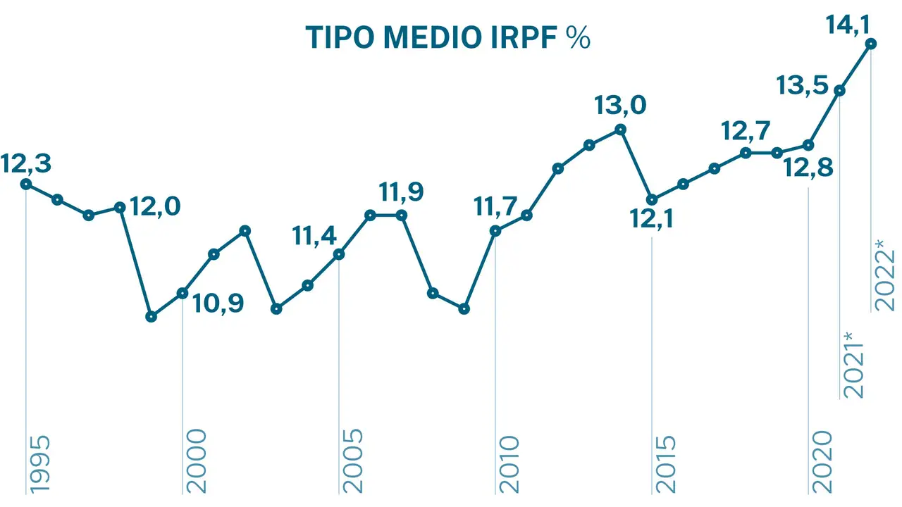 El porcentaje de ingresos que se destina a tributación de la renta no ha parado de crecer desde la última gran reforma estatal del IRPF, que se produjo en el año 2015. Así, el tipo efectivo ha dado un salto desde el 12,1% en aquella fecha hasta el 15,1% el año pasado, un incremento de tres puntos en una década. Si sumamos a la fiscalidad de la renta también la del gasto (es decir, en esencia, el IVA) el tipo efectivo alcanzó un máximo del 16,2%